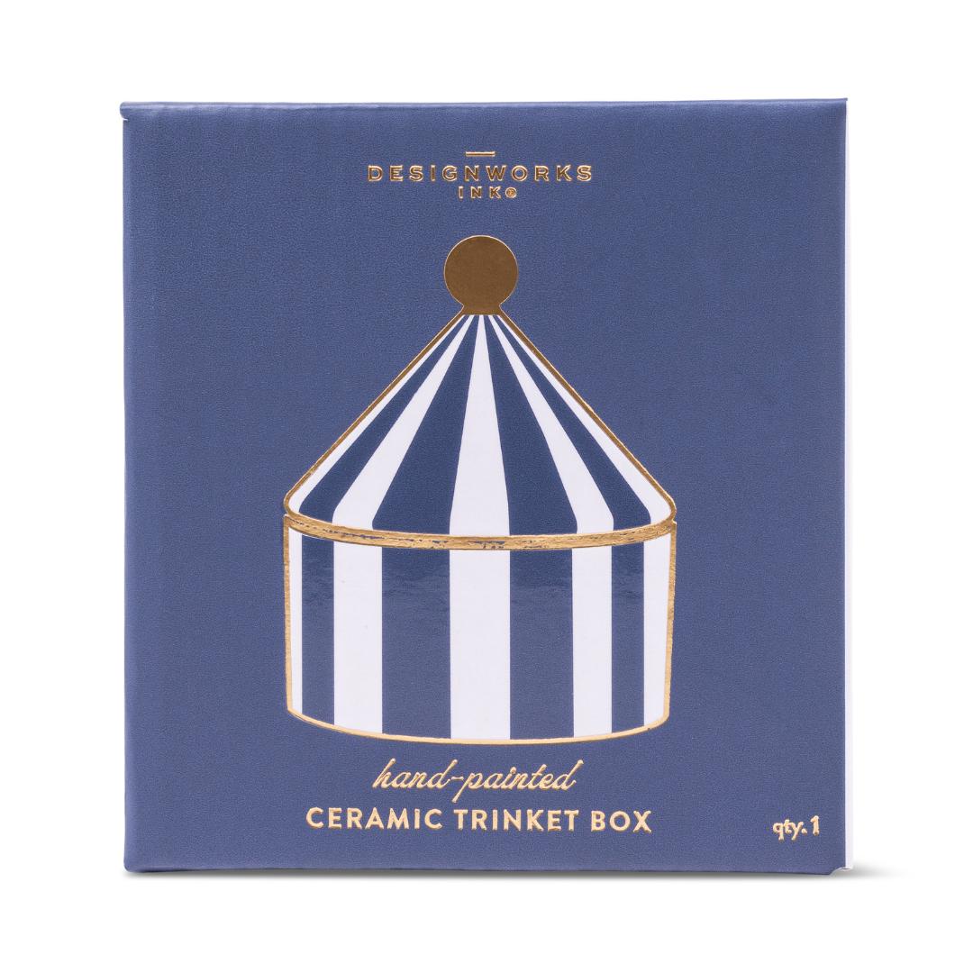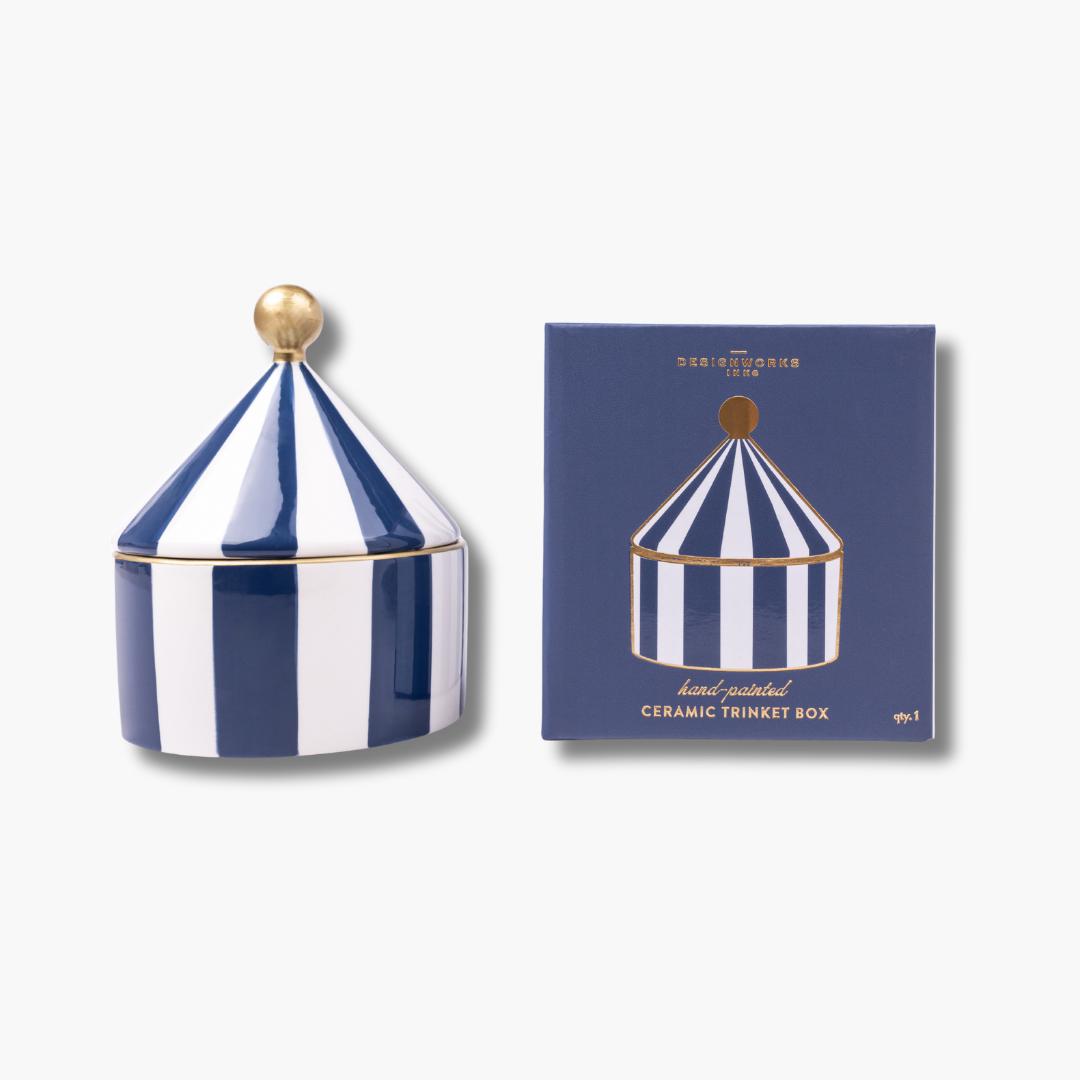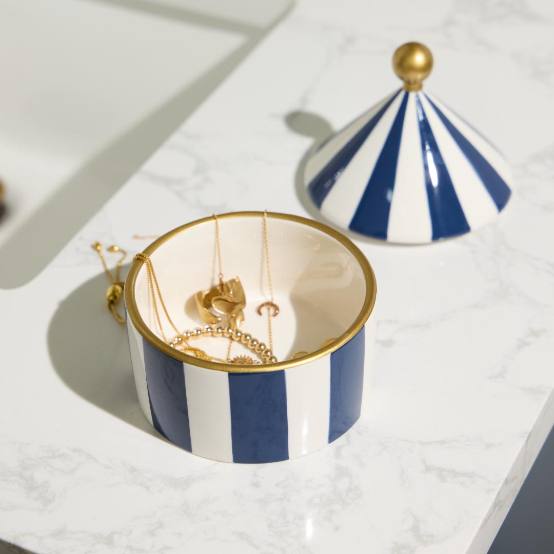 Esta caja decorativa de cerámica combina diseño artesanal y funcionalidad en una pieza única. Pintada a mano con un elegante patrón de rayas en azul y blanco, y rematada con detalles dorados, es perfecta para guardar pequeñas joyas, recuerdos o tesoros cotidianos.