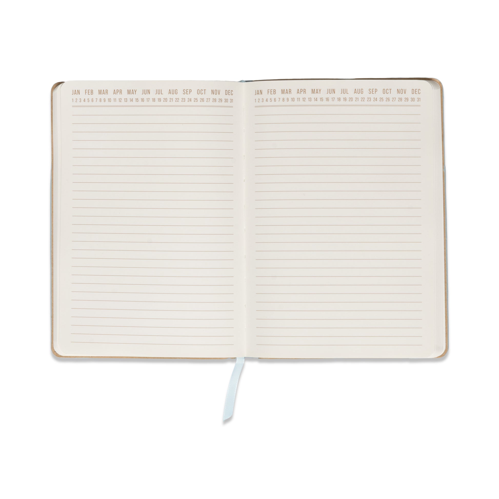 Cuenta con tapa dura (hardbound) que aporta resistencia y durabilidad, además de un diseño estampado que añade personalidad. En su interior encontrarás 200 páginas rayadas con encabezado de día y mes, perfectas para organizar notas, reflexiones o proyectos de forma estructurada.