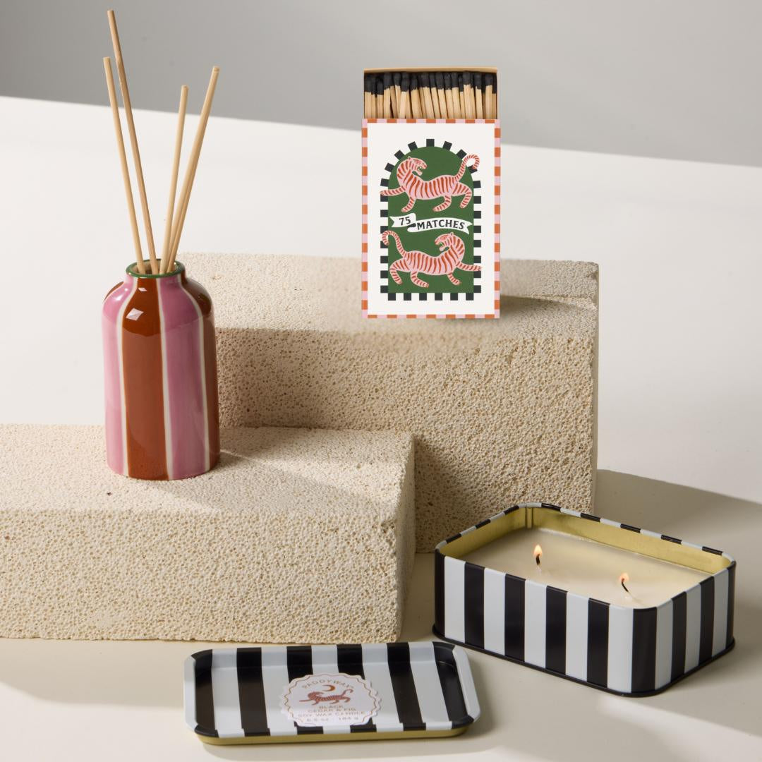 Vela aromática en lata decorativa, perfecta para crear una atmósfera cálida y envolvente en cualquier momento del día.